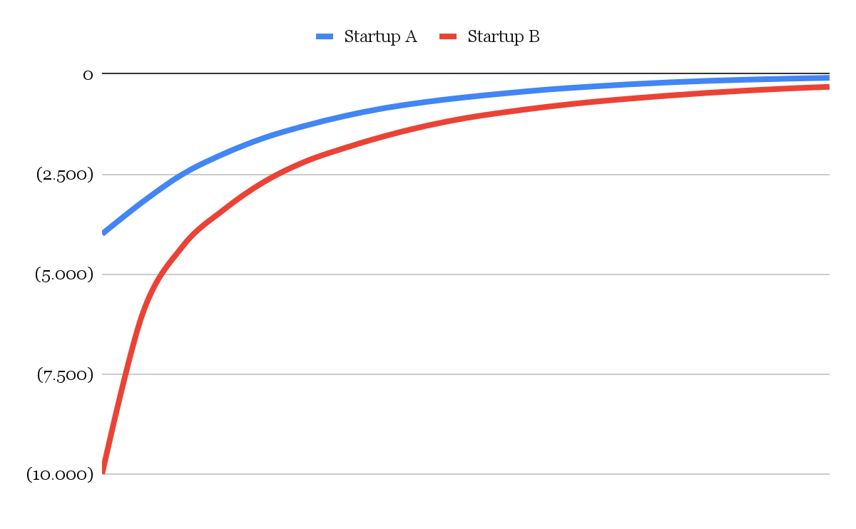 This method gives founders a simple tool for assessing unit economics, more practical than complex LTV models early on. Figure 1 illustrates this: two startups with strong engagement fail to recover acquisition costs, their value curves stuck below zero, proving usage alone doesn't deliver lasting value.