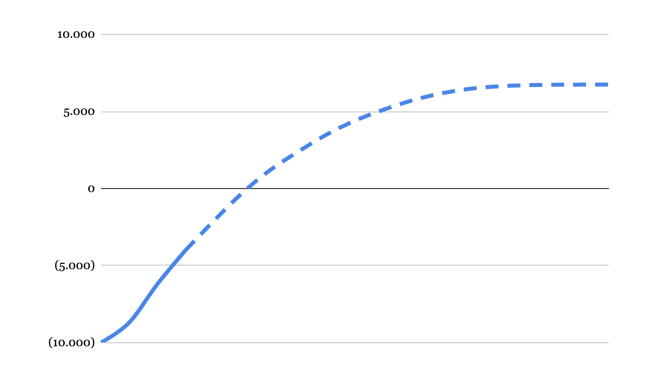Breakeven can wait; the trajectory matters most. A consistent climb enables forecasting, revealing PMF early. Figure 2 shows a cohort curve breaking even and entering positive territory, with a dotted line projecting future profits based on its slope. Steady positive movement ensures even long paybacks create lasting value.